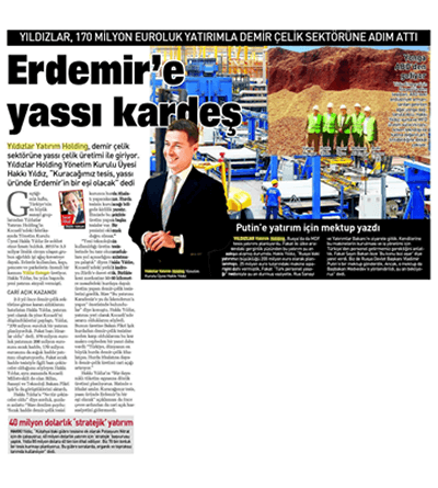 Yıldızlar Yatırım Holding Yönetim Kurulu Üyesi Sayın Hakkı Yıldız, Hürriyet Gazetesi’nden Vahap Munyar’la gerçekleştirdiği röportajında, Yıldızlar Yatırım Holding’in Demir-Çelik Sektörü'ne yaptığı yatırımları ve gündemi değerlendirdi.